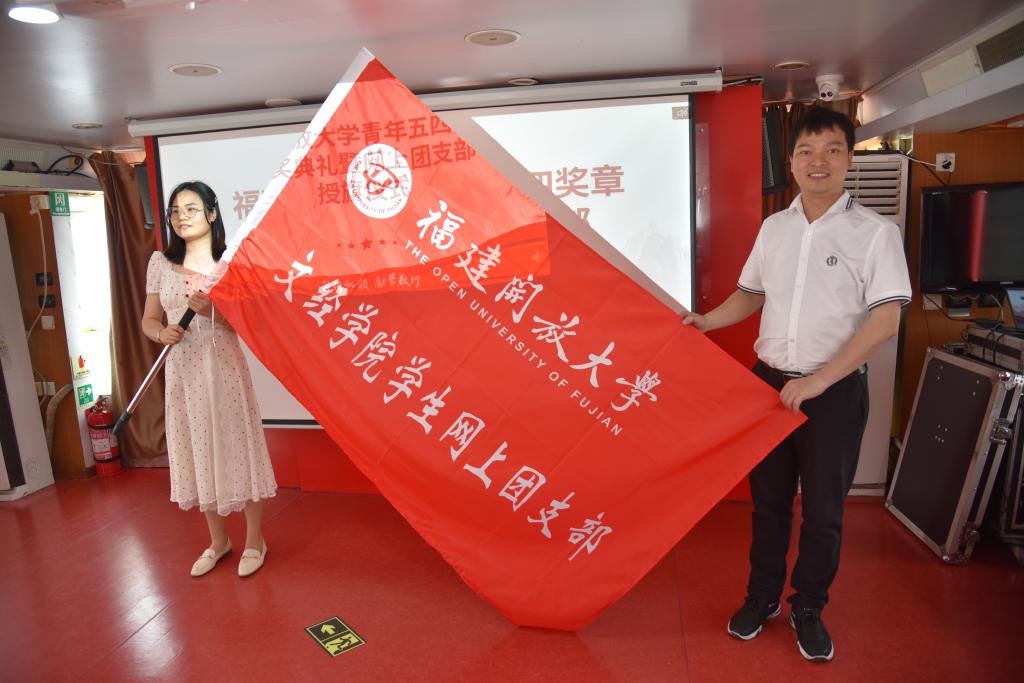 5月28日,在重走闽江地下航线的“鼓山号”客船上,在学院学生骨干培训班师生的共同见证下,文经学院举行网上团支部成立仪式,校团委书记黄生春为文经学院“网上团支部”授旗。