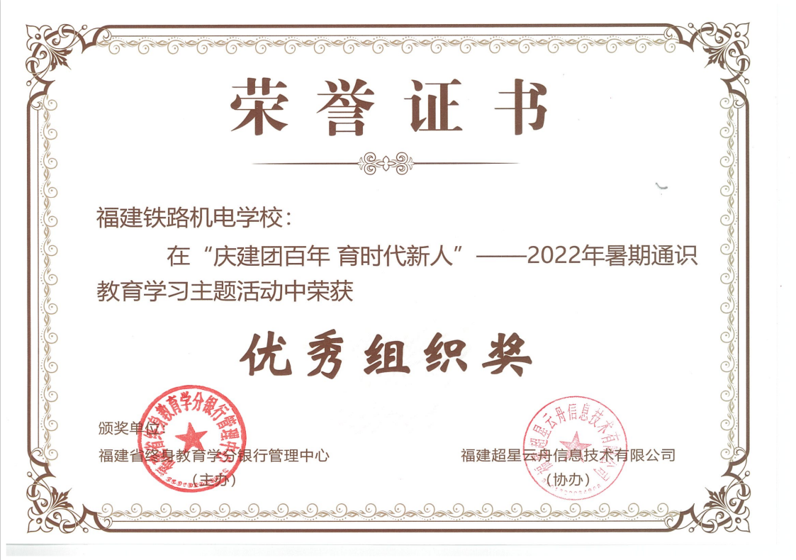 7月15日—8月31日期间,福建省终身教育学分银行管理中心和福建超星云舟信息技术有限公司联合举办了暑期通识教育主题学习活动——“庆建党百年 育时代新人”,职业学院共有1282名学生参加。本次学习活动在各系部、班主任等多方支持下,最终有 1057 名学生取得选修课学分,学院(福建铁路机电学校)因此荣获“优秀组织奖”。
