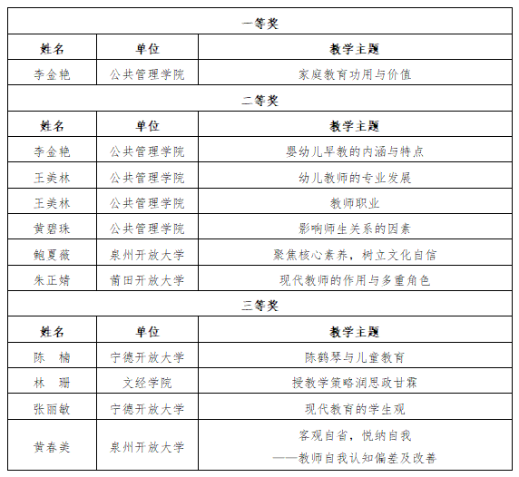 近日,国家开放大学公布教育类专业课程思政优秀教学设计方案获奖名单,其中,我校报送12份参赛作品,分别参加学前教育、小学教育以及教育管理等三个专业赛别的比赛,共荣获11个奖项,学校荣获优秀组织奖。