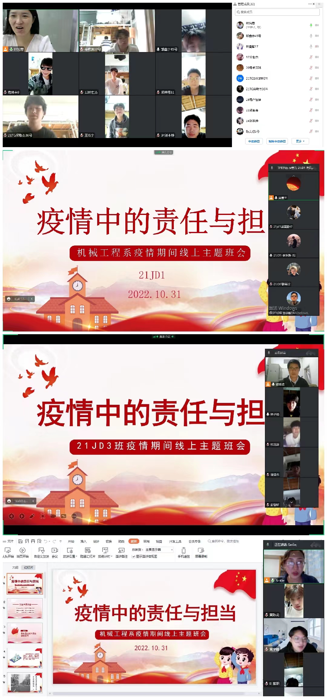 为引导学生在疫情的过严控过程中实现自我管理,帮助学生树立健康阳光的心态,11月1日,系部组织2020级、2021级各班以班级为单位,组织开展了线上疫情防控主题班会活动。
