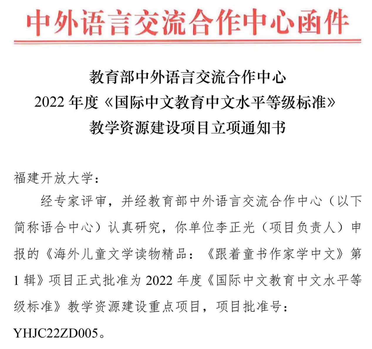 近日,教育部中外语言交流合作中心(原中国国家汉语国际推广领导小组办公室,以下简称“语合中心”)发布教学资源建设项目立项结果,我校副校长、华侨学院院长李正光教授主持申报的《海外儿童文学读物精品:<跟着童书作家学中文>第 1 辑》项目,获批国际中文教育重点资助项目,项目资助资金45万元。这是我校首次获得语合中心教学资源建设重点项目立项。