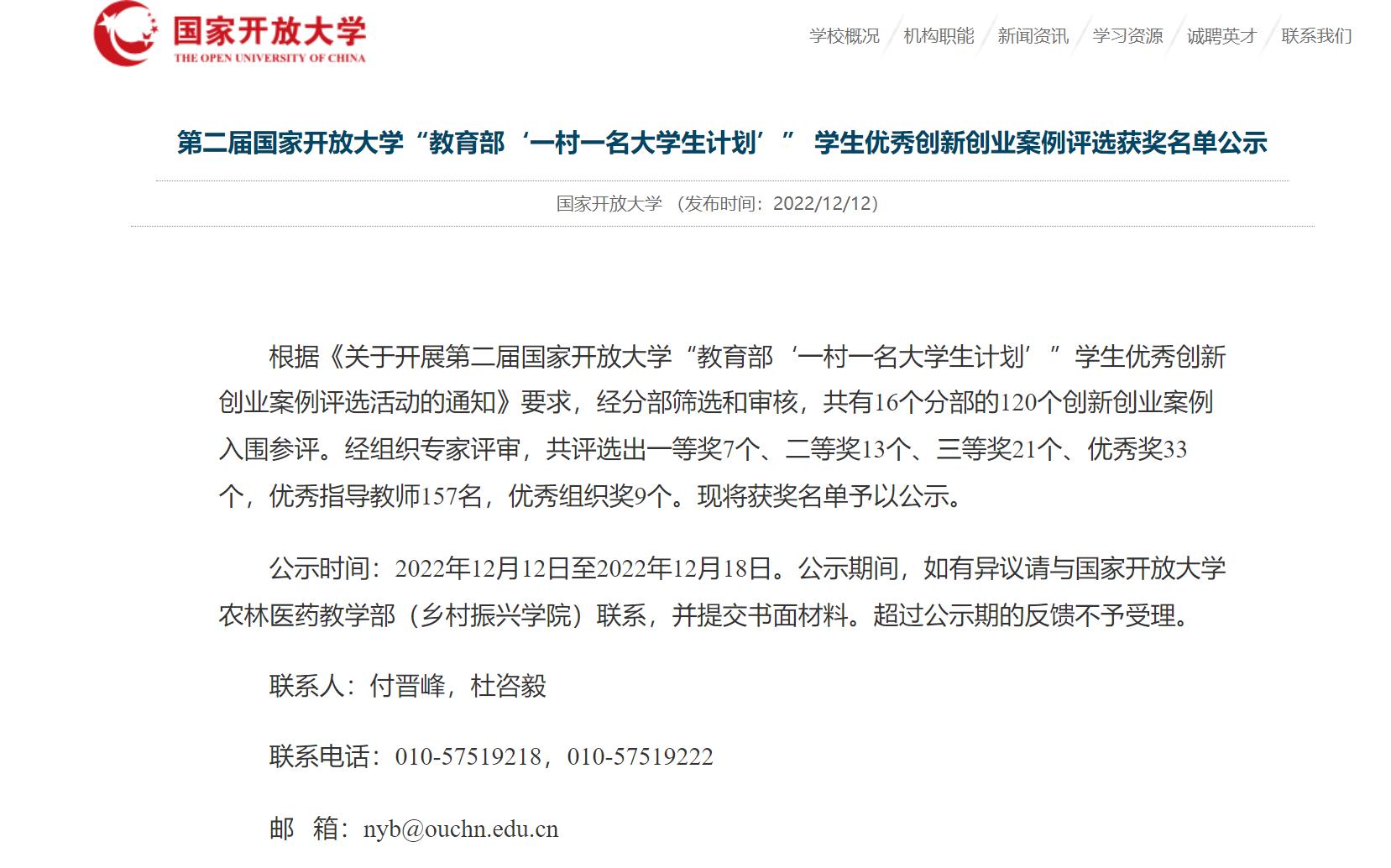 国家开放大学“教育部‘一村一名大学生计划’”学生优秀创新创业案例评选活动获奖名单
