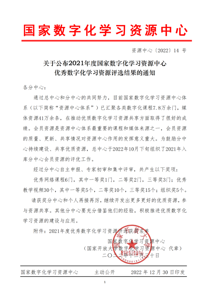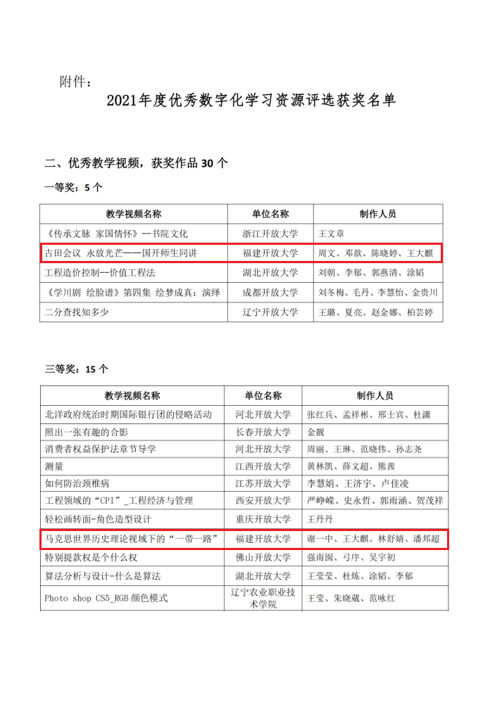近日,国家数字化学习资源中心公布了2021年度国家数字化学习资源中心优秀数字化学习资源评选结果,由我校学生工作处、马克思主义学院和资源建设与管理中心选送的视频资源《古田会议 永放光芒——国开师生同讲》和《马克思世界历史理论视域下的“一带一路”》分别获得2021年度国家数字化学习资源中心优秀教学视频一等奖、三等奖。