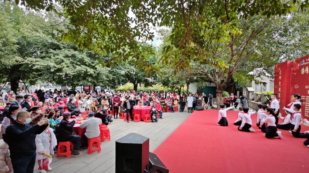 台上民乐合奏展现国粹精华,长笛独奏尽显空灵悠扬,台下的老年朋友们围坐在一张张圆桌边,一边品尝着用心熬制的拗九粥,一边欣赏舞台上的精彩演出。活动现场座无虚席,气氛热烈。