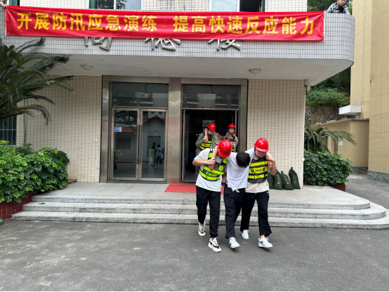 演练开始,各应急小组分工有序、迅速行动。防渗组及时设置现场安全警戒,沙袋整齐堆放在楼宇门口,防止雨水倒灌。转移学生组人员迅速按照指定路线引导学生有序撤离至安全区域,并对学生进行情绪安抚。整个演练过程共计半小时,各小组均圆满完成演练任务。