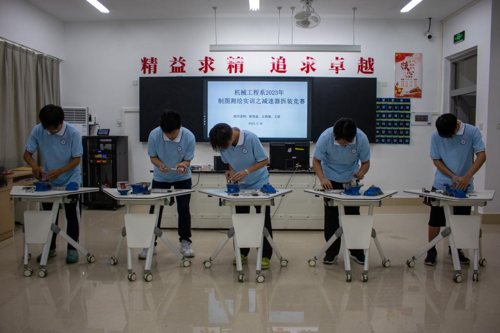 5月26日下午,由职业学院机械工程系团总支与机电教研组联合举办的2023年制图测绘实训之减速器拆装竞赛在博雅楼机械基础实训室火热开赛。比赛由陈雪晶、丘锦福、王招三位老师担任指导,2022级机电、车辆专业班级分别选派同学参加比赛。
