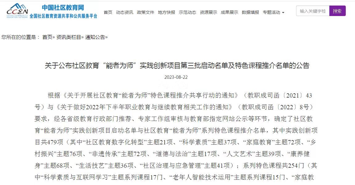 近日,教育部职业教育与成人教育司发布《关于公布社区教育“能者为师”实践创新项目第三批启动名单及特色课程推介名单的公告》,经各省级教育行政部门推荐、专家工作组审核与教育部指定网站公示等环节,全国共启动第三批实践创新项目479项,共254门系列特色课程被推介。我校申报的两门课程“非遗传承”之闽韵雅舞、“非遗传承”之守艺承袭被推介为“非遗传承”主题特色课程。被推介的课程将在中国社区教育网、日新学习网、“网上社区教育大讲堂”微信公众号进行展示。