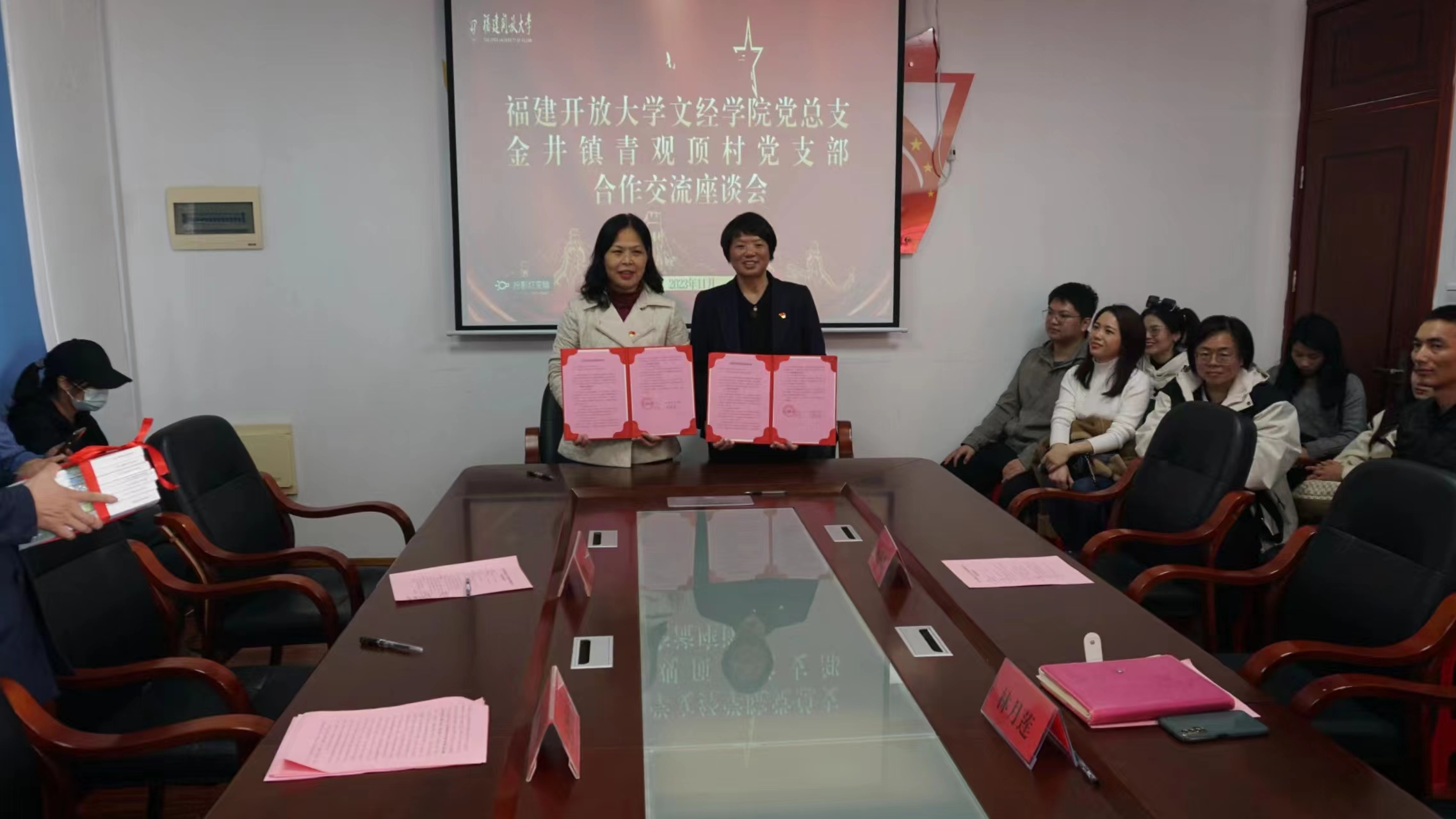 在青观顶村村部,文经学院党总支与青观顶村党支部召开党建合作交流座谈会。王妙真介绍了学院党总支基本情况和近年来立足实际推动教育赋能乡村振兴战略的工作情况。林月莲介绍了青观顶村党支部以基层党建推动乡村振兴工作高质量发展的举措。在师生党员的见证下,王妙真与林月莲签署了文经学院党总支与清观顶村党支部结对共建协议,双方约定,发挥文经学院专业师资团队和科技特派员团队作用,为青观顶乡村振兴提供教学资源,输送人才;探索在青观顶村设立实践教学基地,为文经学院相关专业学生实践活动提供资源和平台;建立党建工作交流机制,共同推进学生网上党支部建设。王妙真还向林月莲赠送了学院自编的茶艺与茶文化专业系列教材。