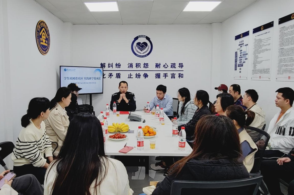 社团成员首先跟随仓山公安分局仓前派出所辅警陈艺杰走进仓前派出所E体+多维调处中心,体验他们的工作日常,感受他们为民服务、维护群众利益的过程。陈艺杰是我校2022年度国家开放大学优秀毕业生,他从事调解工作十余年,在街坊邻居中有口皆碑,“有矛盾找小陈”,已经成为仓前群众遇到矛盾时的口头禅。除了日常尽职尽责的调解,陈艺杰始终坚持做好调解工作后的“回头看”,每月都会积极回访调解后的当事人们,看看纠纷是否解决妥当。活动中,陈艺杰根据《人民调解法》向在场师生讲解了人民调解的定义、原则、适用的纠纷类型、调解协议的法律效力等内容,并结合身边实实在在的例子,系统而不失趣味地向与会师生讲述了人民调解的优势,有理论、有案例,生动的将人民调解的知识传递给现场在座的师生。