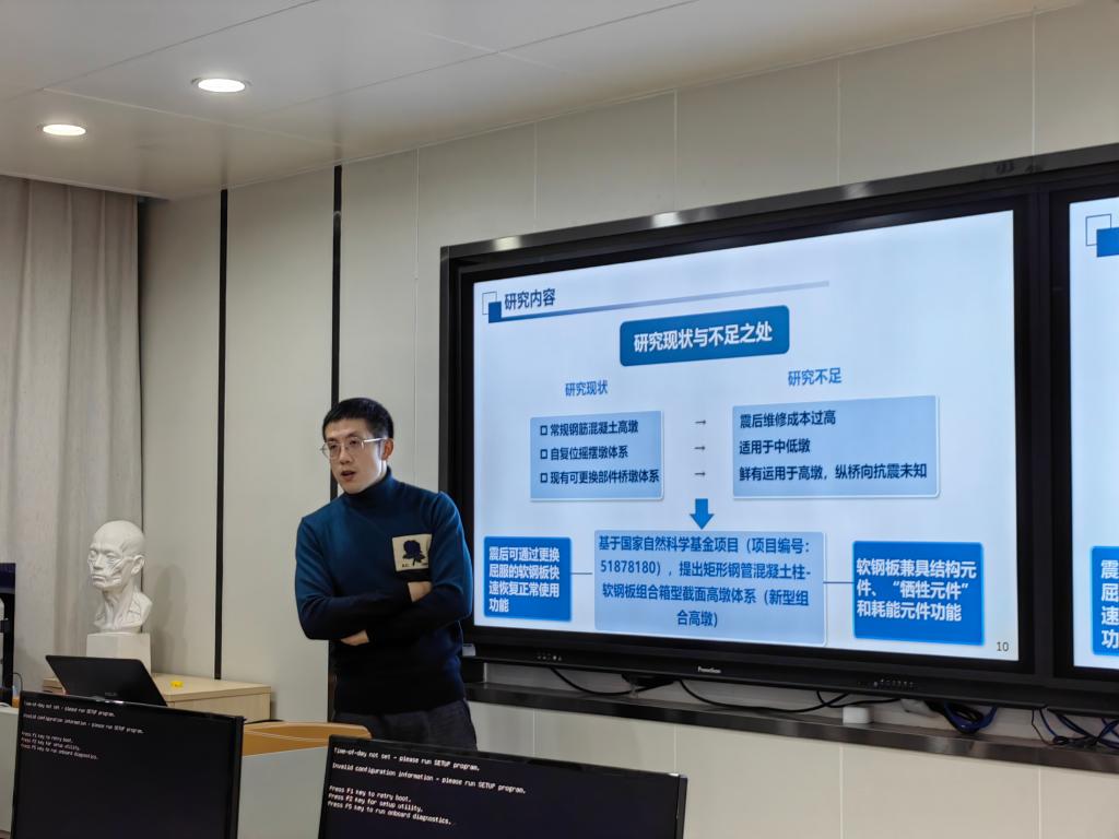 蔡哲罕博士为大家带来《路桥工程的新材料与新结构研究进展报告》主题分享。蔡哲罕为福州大学土木专业博士,主要从事组合结构与桥梁、结构抗震等领域研究,参与多项国家自然科学基金面上项目、福建省科技厅、交通厅合作项目以及校企合作项目,并以第一作者身份发表SCI、EI期刊论文共计6篇,获专利1项。他向大家分享了自己读博期间的学习和科研经历,从我国交通基础设施方面取得的成就、地震带高墩桥梁施工面临的挑战等方面展开,就如何降低高墩桥梁在地震中的损伤及震后功能快速恢复、如何在现有乡村房屋建筑的加固修缮中引入新材料与新结构等方面进行可行性探究,探索一条以计算机、农林、土木、机械、化工等专业为核心的特色交叉学科发展道路。