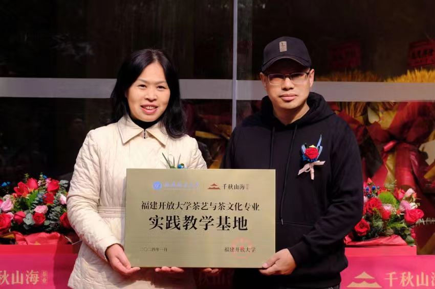 1月1日上午,在福建千秋山海功夫茶业有限公司品牌启动仪式现场,文经学院院长王妙真向福建千秋山海功夫茶业有限公司总经理圣键授福建开放大学茶艺与茶文化专业实践教学基地牌。