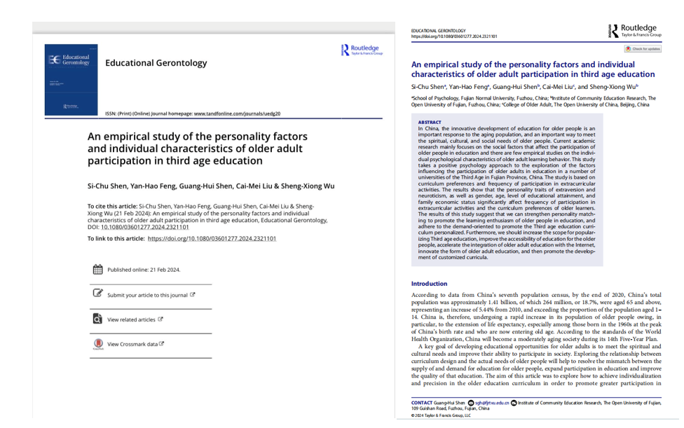 据悉,《教育老年学》(Educational Gerontology)是由著名老年教育专家彼特森(Peterson D.A.)于1976年创办并出版的SSCI期刊,该刊致力于为世界各地的老年教育研究者提供思想交流平台,在国际老年教育领域极具影响力。近年来,以沈光辉教授领衔的我校老年教育、终身教育研究团队持续发力,深度产出,除了在国际国内高水平刊物发表一批优质学术成果外,还有多个课题分获全国教育科学规划、省社科规划等高层次项目立项。
