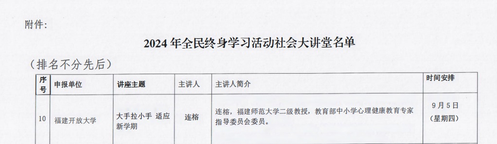 近日,从中国成人教育协会下发的《关于公布2024年全民终身学习活动社会大讲堂名单的通知》中获悉,由我校家庭教育研究所客座教授、所长连榕(福建师范大学二级教授,教育部中小学心理健康教育专家指导委员会委员)主讲的“大手牵小手 适应新学期”开学家长第一课,入选“2024年全民终身学习活动社会大讲堂”名单,后期将在中国成人教育协会官网和全民终身学习公共服务平台宣传、推介、展示,并通过相关数字媒体进行宣传报道。