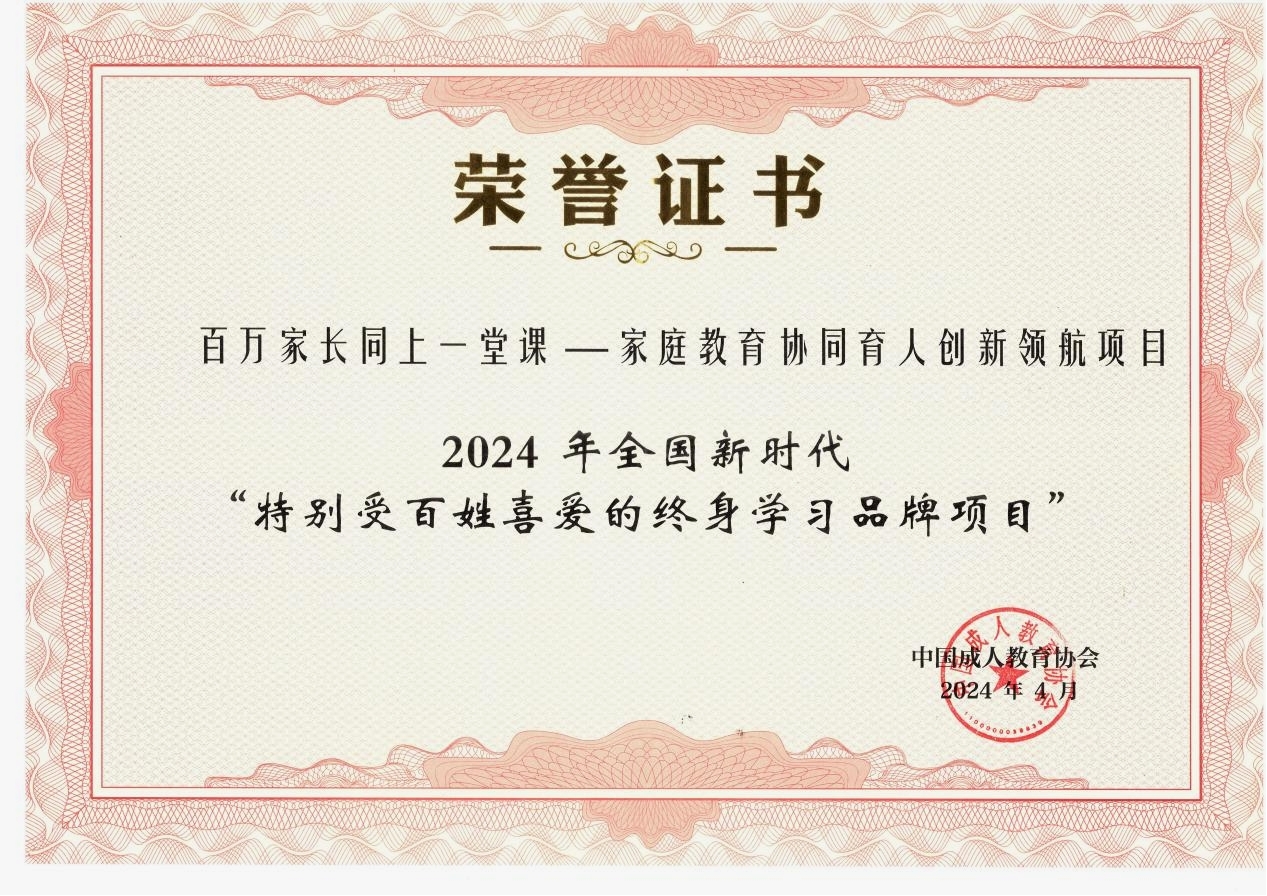4月26日,由教育部、中央宣传部等五部委主办的2024年全民终身学习活动周全国总开幕式在辽宁省沈阳市举行。开幕式上公布了194个全国新时代“百姓学习之星”和191个全国新时代“终身学习品牌项目”宣传推介名单,我校“百万家长同上一堂课——家庭教育协同育人创新领航项目”被推介为全国新时代特别受百姓喜爱的终身学习品牌项目。