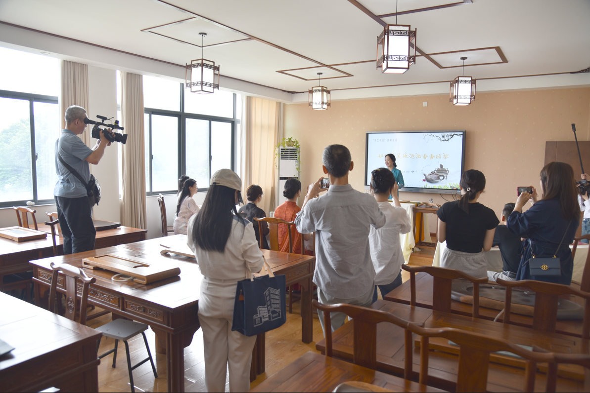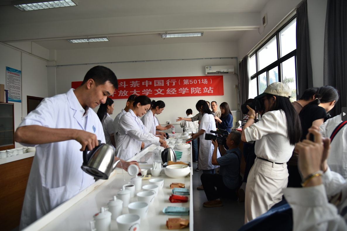 在茶艺实验室,茶艺与茶文化专业师生围绕 “如何美美地泡出香香的茶"的主题,开展"茶艺技法”教研活动,通过现场实践操作,从科学性和艺术美两者兼顾的角度探讨了茶艺手法和泡饮技巧对茶汤品质和茶艺美感的影响,解决学员们日常泡茶的困惑。2023年春季茶艺与茶文化专业学生张绿荫以茶为纸、以水为墨,展示了宋朝点茶漏春影、茶百戏制作过程,让现场观众一睹“水上丹青”之妙作,以及非遗传统技艺在新时代焕发的新生命力。在审评实验室,手指轻扬,茶汤注杯,茶香四溢。一杯杯福州茉莉花茶,福鼎白茶和武夷岩茶依次排列。茶专业师生采用专门的审评器具,固定的冲泡时间,用五项评茶法,对茶叶的色泽、香气、汤色、滋味和叶底一一进行品鉴。通过品鉴,体会多彩闽茶的独特魅力,体验福州茉莉花茶的鲜灵浓醇、福鼎白茶的毫香蜜韵、武夷岩茶的岩骨花香。