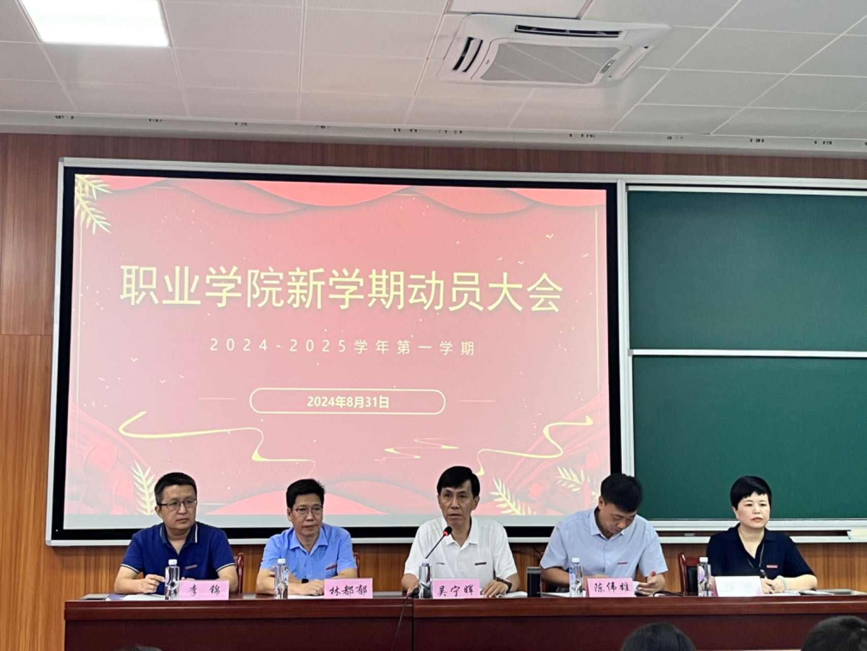 8月31日上午,职业学院于阶梯教室召开2024-2025学年第一学期动员大会,学院班子成员就分管业务范围总结上学期及暑期工作,并安排部署新学期重点工作。大会由党总支书记吴宁晖主持,全体教职员工共同出席。