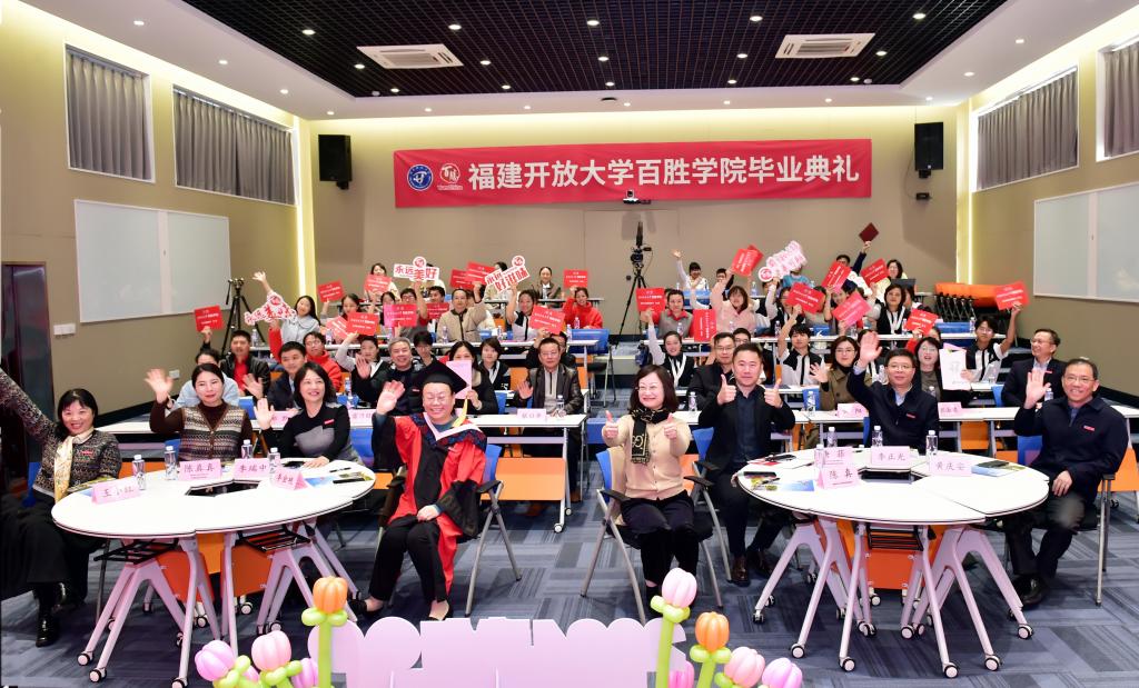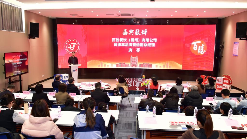 寒暑六载携手共育,春华秋实硕果满枝。为深入总结校企合作办学阶段性成果,持续推进校企融合育人的实践与探索,12月20日下午,学校在左海校区智慧教室举行百胜学院校企合作办学阶段性成果总结表彰暨2024年毕业典礼。毕业典礼通过线上线下互联互通的方式举行,学校党委委员、副校长李正光,百胜餐饮(福州)有限公司肯德基品牌营运副总经理唐菲出席并致辞。学校及百胜餐饮(福州)有限公司相关部门负责人、教师代表、百胜学院毕业生代表等60余人线下参加典礼,闽潮地区百胜学员通过云端直播线上参与仪式。