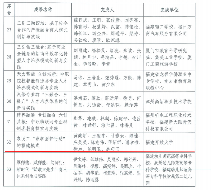 近日,福建省教育厅发布《福建省教育厅关于公布2024年省级教学成果奖获奖成果的通知》(闽教师〔2025〕5号),我校黄健新教授带头的教学研究团队申报的项目《农民工“求学圆梦行动”的福建模式》荣获特等奖。