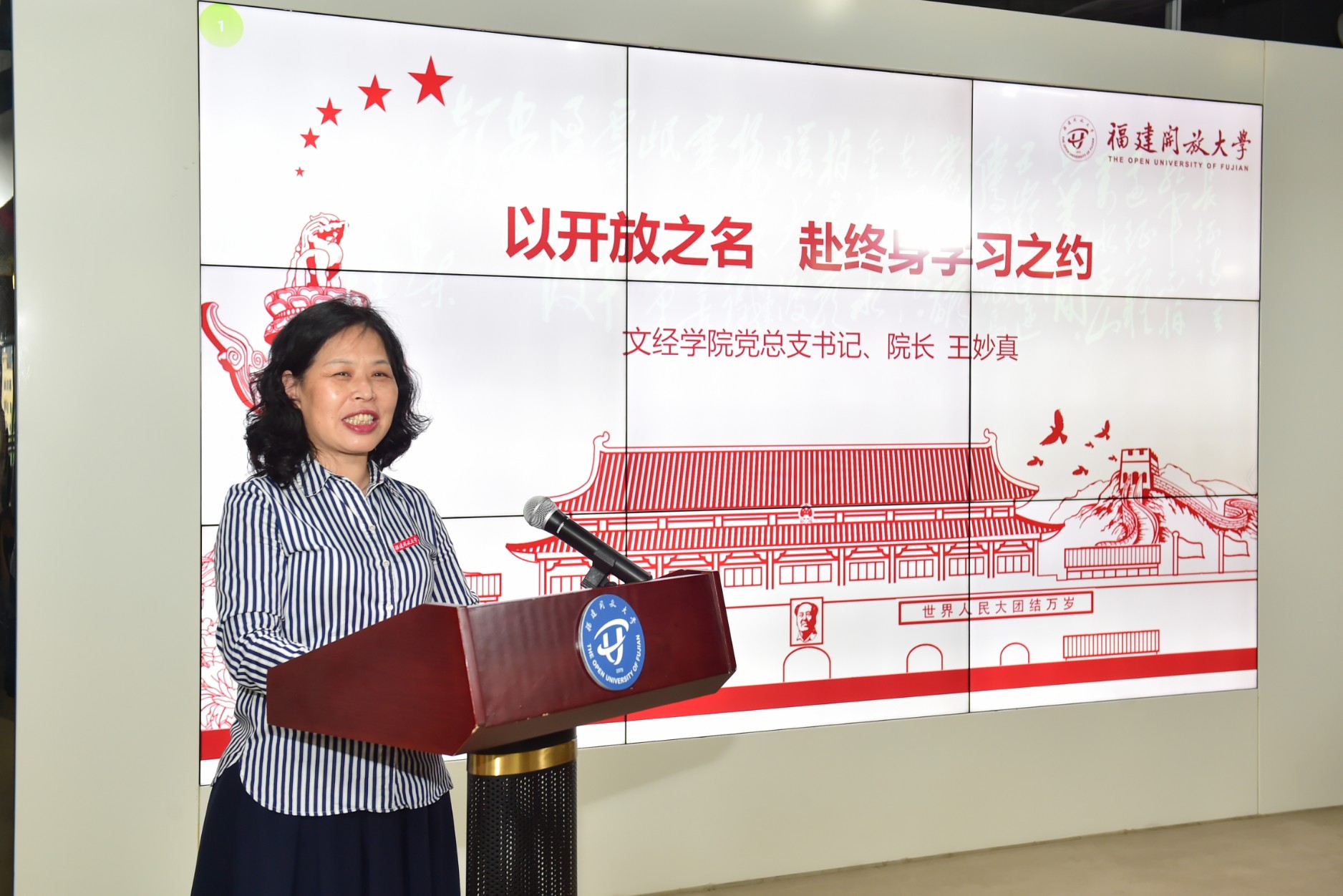 文经学院党总支书记、院长王妙真以“以开放之名,赴终身学习之约”为题讲思政课。王妙真介绍了学院办学和师资情况,特别是今年顺应社会需求,新增设网络与新媒体本科、烹饪工艺与营养专科的情况,并对同学们提出三点希望。一是掌握学习方法,平衡工学收获成长。要善用学校提供的“远教+近辅”模式,依托高效畅通的互联网平台,提高学习效率,处理好工学矛盾,做到学有所得、学有所成。二是坚持知行合一,融合理论助力发展。要积极参与现场教学与社会实践,在实际操作中深化知识理解,积累经验,提升解决问题的能力,为未来职业发展筑牢根基。三是树立终身学习理念,用知识为职业发展赋能。在学习过程中秉持平常心、坚守坚韧心、永葆进取心,不断汲取知识,提升专业技能,拓宽视野,提升自我价值。