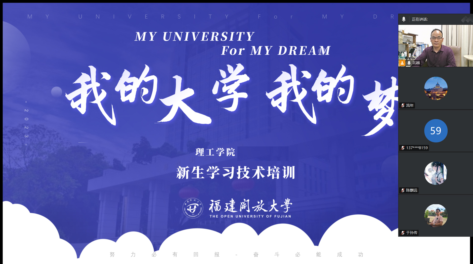 当晚,招生与学生工作科科长何李标以线上直播的形式开展新生学习技术培训,他向同学们详细介绍了福建开放大学办学历程、校歌、校训、学习途径、课程考核方式、专业实践教学、校园文化活动等方面的内容,提升了新生们对学校的认同感和归属感,让他们尽快适应角色转变,适应新的学习生活。