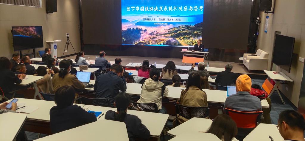 汪文学教授长期深耕于民族文化与旅游规划等领域,主要从事中国古代文化与文学、贵州地域文化与文学研究,独立主持国家社科基金课题研究2项,发表学术论文60余篇,出版学术著述10余种。讲座中,汪教授立足全国视野,聚焦行业前沿,对当前中国旅游业发展现状进行了深入剖析,并结合具体数据和案例,分析了旅游业作为拉动内需、繁荣经济的支柱产业所面临的机遇与挑战。他就如何推动“山海协作”,实现区域旅游资源优势互补提出了富有建设性的思考。在互动环节,与会师生踊跃提问,就旅游业数字化转型、区域旅游协作模式等话题进行深入交流,现场学术氛围浓厚。