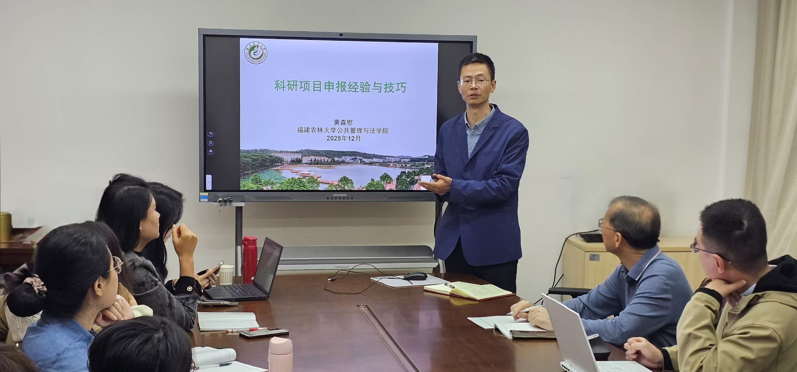 为提升我校教师科研项目申报能力,助力高水平科研项目立项,12月4日,学校邀请福建农林大学公共管理与法学院博士生导师黄森慰教授开展题为“高层次科研项目申报经验与技巧”的学术讲座。本次讲座由科研处与公共管理学院共同组织,是第五届学术月系列活动之一,吸引了来自科研处、公共管理学院、文经学院及理工学院近四十位教师与科研人员积极参与。科研处处长、公共管理学院院长黄庆安教授主持讲座。