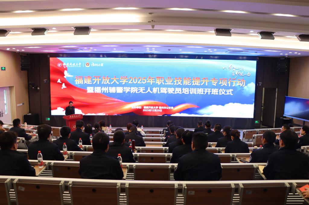 12月29日上午,福建开放大学2025年职业技能提升专项行动暨福州辅警学院无人机驾驶员培训班开班仪式在桂山校区智慧教室举行。职业学院副院长汪媚、理工学院(辅警学院)副院长章学珠,以及我校与福州市公安局相关科室负责人和36名辅警学员参加。