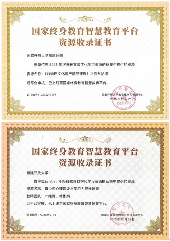 学校始终坚持以新时代高等教育内涵式发展为战略方向,将优质学习资源建设作为深化教学改革、提升人才培养质量的重要抓手,不断完善课程资源建设机制,大力推进优质课程的培育与推广。在资源建设方面取得显著成效:非学历教育课程《非物质文化遗产精品课程(海丝拾遗)》与学历教育课程《青少年心理建设与学习力双维培育课程》成功入选国家终身教育智慧教育平台。该平台是教育部落实国家教育数字化战略、贯彻《教育强国建设规划纲要(2024-2035年)》的重要举措,旨在推动教育公平、提升教育质量、弥合数字鸿沟,构建“人人皆学、处处能学、时时可学”的终身学习体系。
