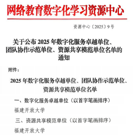 近日,国家开放大学网络教育数字化学习资源中心公布2025年度优秀分中心评选结果,学校凭借在数字化服务与资源共享方面的突出表现,荣获“数字化服务卓越单位”与“资源共享模范单位”两项荣誉称号。此外,学校《家庭教育三部曲》课程视频资源获评“数智赋能视频资源”奖,《计算机网络安全》课程视频资源获评“特色视频资源”奖,《生成式人工智能赋能开放大学微课资源开发与实践》入选“人工智能赋能教育教学”优秀案例。