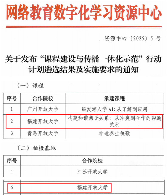 同时,在国家开放大学数智创新课程建设、课程建设与传播一体化示范等四项行动计划中,我校《构建和谐亲子关系:从冲突到合作的沟通艺术》课程成功入选“课程建设与传播一体化示范”项目,学校获得拍摄基地认定。