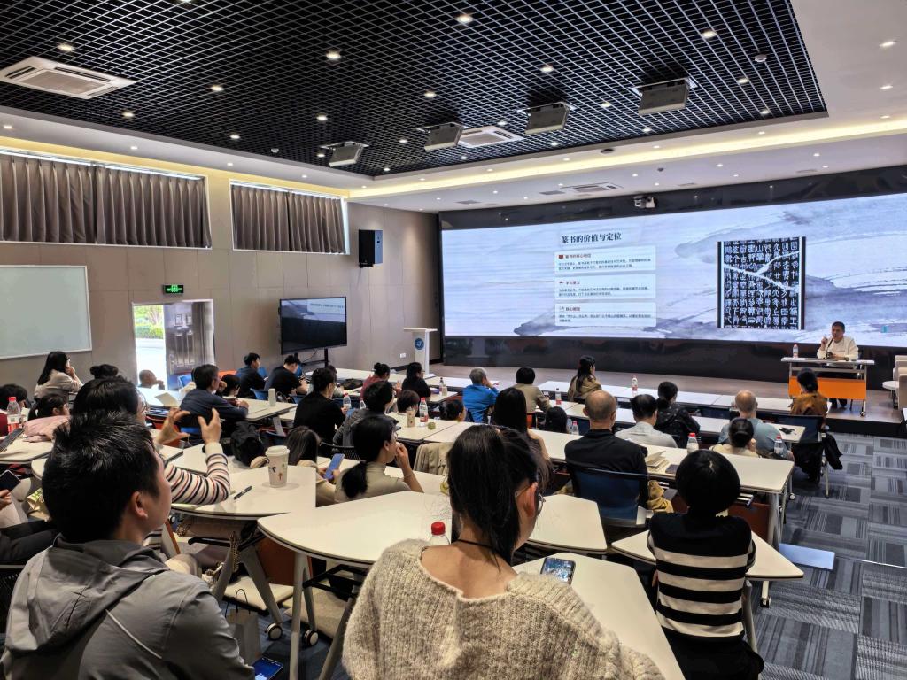 当日下午,左海校区智慧教室座无虚席,张家汶以《篆书的取法与创作》为题,作书法学专业“开学第一课”专题讲座,旨在引导师生在新学期伊始聚焦学术前沿,拓展创作视野。张家汶结合自身多年的创作实践与教学经验,系统梳理了篆书的历史演变、审美特征、取法路径及当代创作理念。通过大量经典作品分析与现场示范,深入浅出地阐释了篆书学习的要点与精髓。讲座内容翔实、视角独到,现场互动踊跃,师生纷纷表示深受启发,对篆书的研习与创作有了更为系统和深入的认识。