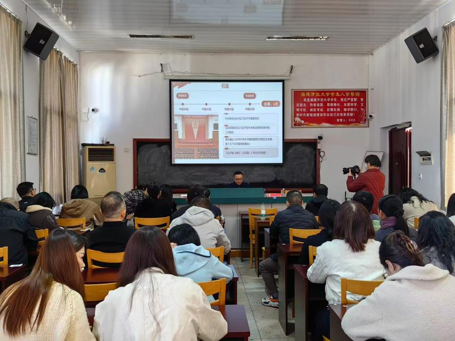 校团委副书记、文经学院副院长许勇以《为推进中华民族伟大复兴贡献青春力量》为题,为党员师生宣讲党的二十届四中全会精神,并为参训学生骨干讲思政课。授课中,许勇围绕党的二十届四中全会精神核心要义,结合青年成长发展实际,从理想信念培育、责任担当践行、青春价值实现三个维度展开阐释。他号召青年学生认真学习贯彻全会精神,把理想信念融入到日常生活里、工作岗位上、人际交往中,践行“请党放心,强国有我”的青春誓言。