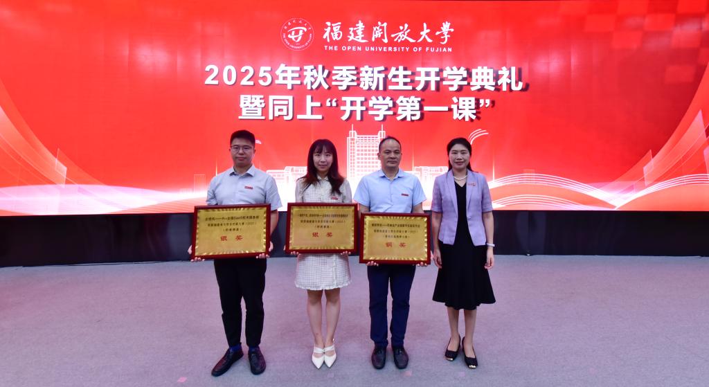 开学典礼表彰了2025年福建省大学生创新大赛获奖项目,庄莉为获奖代表颁发了奖牌。与会校领导为新生代表佩带了校徽。